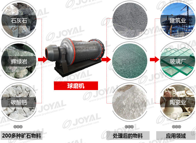 球磨机根据排矿方式不同可分为格子型和溢流型两种,本机为两仓格子型球磨机。机器工作时,物料由进料装置经入料中空轴螺旋均匀地进入磨机一仓,该仓内设有阶梯衬板或波纹衬板,内装不同规格钢球,筒体转动产生离心力将钢球带到一定高度后落下,对物料产生重击和研磨;物料在一仓达到粗磨后,经单层隔仓板进入二仓,该仓内镶有平衬板,内装钢球,将物料进一步研磨;粉状物料通过卸料箅板排出,完成粉磨作业。